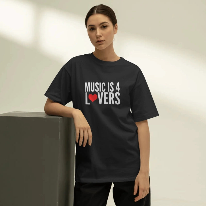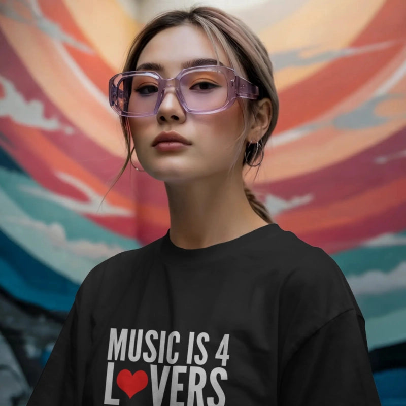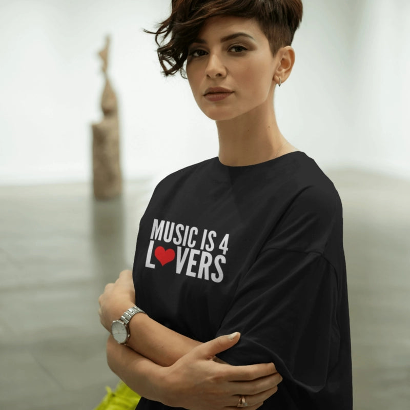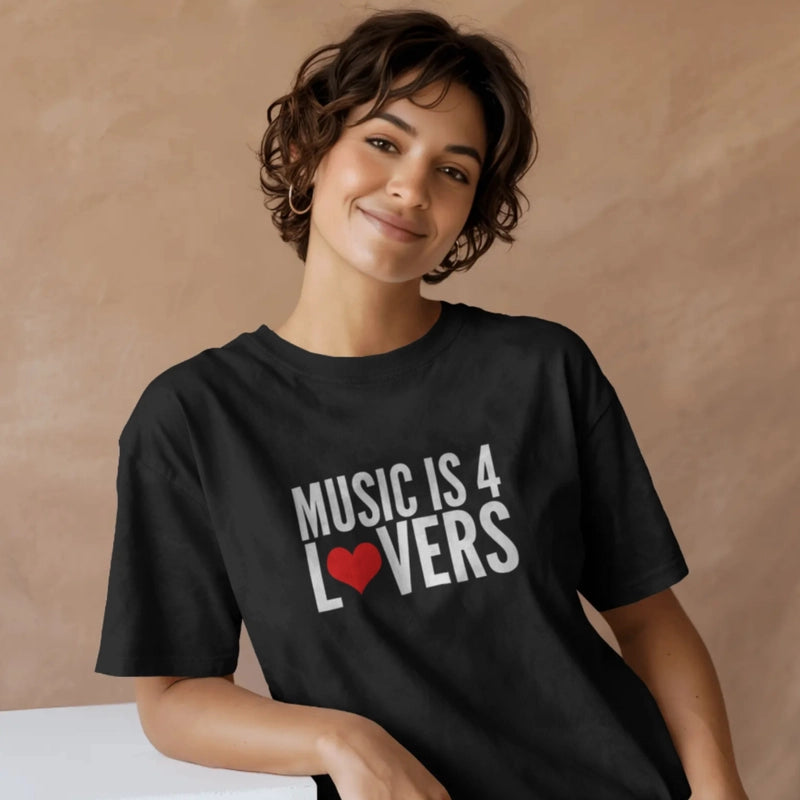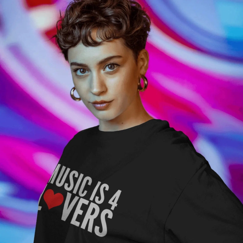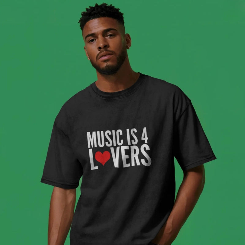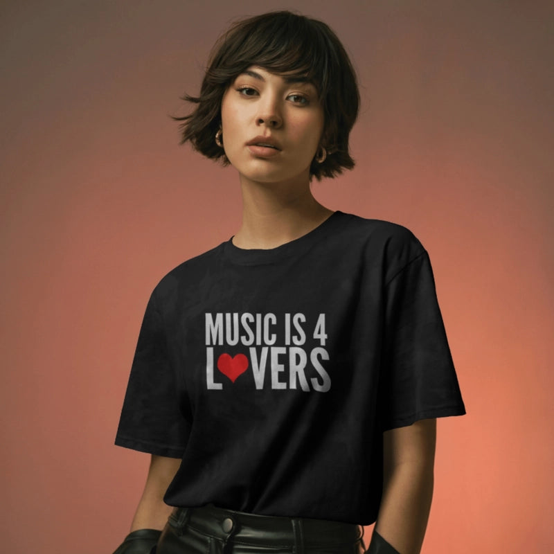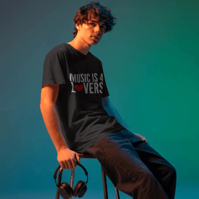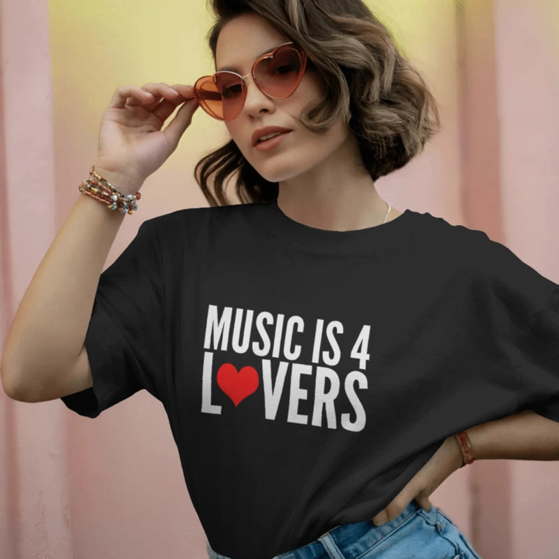 Shout out your love for music loud and proud! our iconic "music is 4 lovers" tee lets you wear your heart on your sleeve.