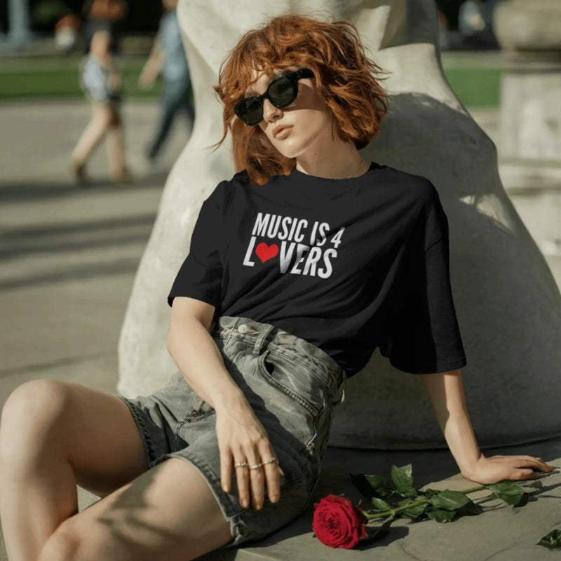 With its unique 'Music is 4 Lovers' statement and eye-catching red heart, this tee ensures you're noticed for your passion. It’s a conversation starter, making connections and unforgettable memories easy.